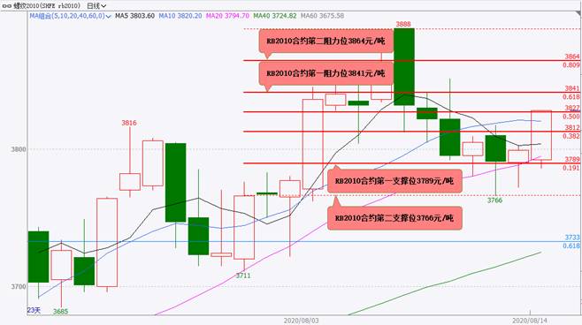 预期,8月17日,螺纹钢期货主力合约RB2010大概率将震荡上涨,支撑位3789和3766元/吨,阻力位3841和3864元/吨。