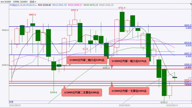图32020-07-31-2020-09-14股指期货IC2009合约日K线走势图黄金分割线和水平线技术分析