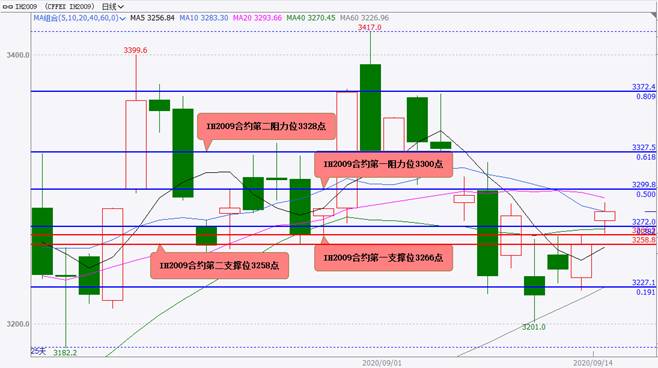 主力合约IH2009开盘3276.8点,开盘后,小幅震荡上行,小幅上涨,最高上涨至3289.8点,在3300点附近有较明显短线反弹阻力,最低下探至3267.2点,在上周五高点3266.2点附近有较明显短线支撑,目前在3284点附近偏强震荡。预计日内IH2009大概率将震荡上行,阻力位3300和3328,3328点附近的短线反弹阻力较强,日内难以有效突破,支撑位3266和3258点,上周五收盘价3258.8点附近的短线支撑较强。