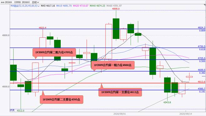 主力合约IF2009开盘4636.0点,开盘后,小幅震荡上行,小幅上涨,最高上涨至4654.2点,在4660点附近有较明显短线反弹阻力,最低下探至4623.6点,在上周五收盘价4612.6点附近有较明显短线支撑,目前在4640点附近偏强震荡。预计日内IF2009大概率将震荡上行,阻力位4660和4705点,4705点附近的短线阻力较强,日内难以有效突破,支撑位4612和4595点,4595点附近的短线支撑较强。