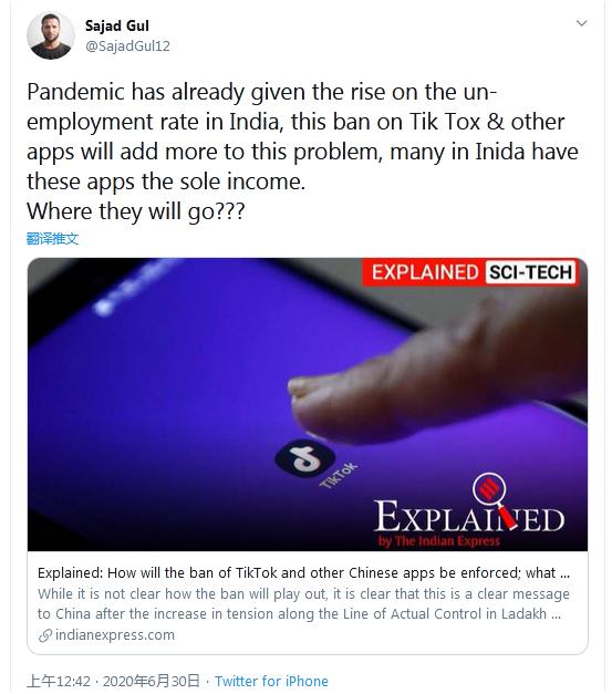 网友Sajad Gul:“疫情已经让印度失业率上升,针对TikTok以及其他应用的禁令将使(失业率)问题变得更加严重,许多印度人将这些应用作为唯一的收入来源。那他们以后要去哪儿?”