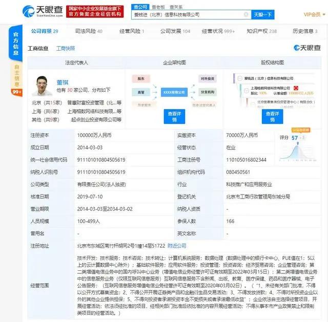 天眼查数据显示,爱钱进的关联公司为爱钱进(北京)信息科技有限公司,该公司成立于2014年3月,注册资本10亿人民币,法定代表人为董祺,公司经营范围包括技术开发;技术服务;技术咨询;技术转让;投资管理;投资咨询;经济贸易咨询;企业管理咨询等。