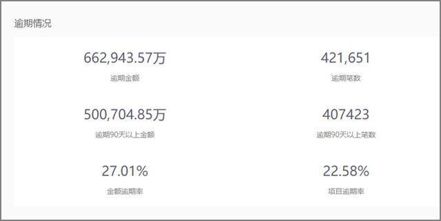 根据平台数据显示,爱钱进待收的本息金额累计高达258.6亿元,逾期金额为66.29亿余元,金额逾期率为27.01%,项目逾期率为22.58%。