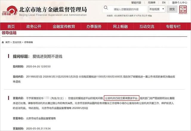 北京市地方金融监督管理局官网互动交流版块的内容显示,今年4月26日,有投资人表示:“2019年8月5日、2020年3月31日、2020年3月28日分别购买爱钱进11000元、1000元、1000元,现在到了期爱钱进一直以市场活跃度低为理由拒绝退钱”。
