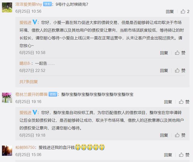 今年6月,爱钱进的官方微博几乎保持着每日更新的频率。不过,在爱钱进的每一条微博下方,都有类似于“赶紧还钱吧”“为什么还不还款”等评论。