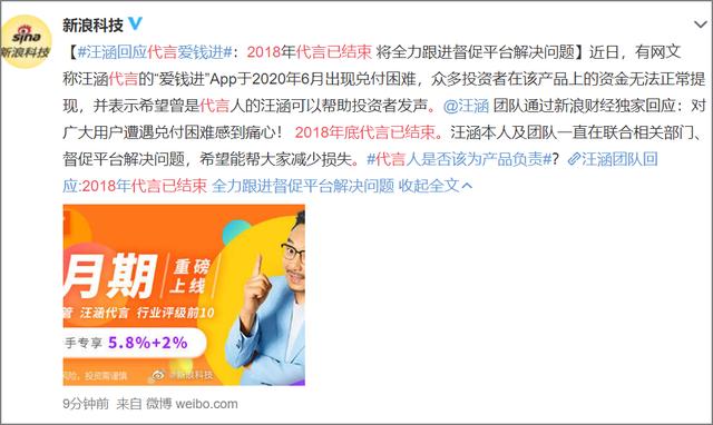 据悉,早在2016年汪涵就成为了爱钱进平台的代言人,不过据中新经纬报道,在2019年1月之后,爱钱进官微和汪涵之间再无互动。