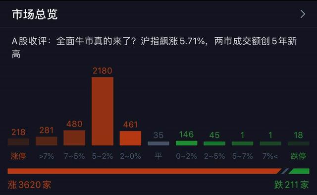 个股方面,两市3620只个股上涨,涨停218家,仅211只个股下跌。