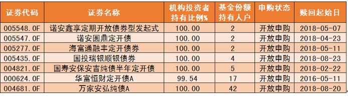 进一步统计后发现,有7只定开基金机构持有人比例超90%以上,持有户数不足100户,且目前依然处于申购状态。对于这些定开基金,各位基民务必要小心。名单如下,仅供参考!
