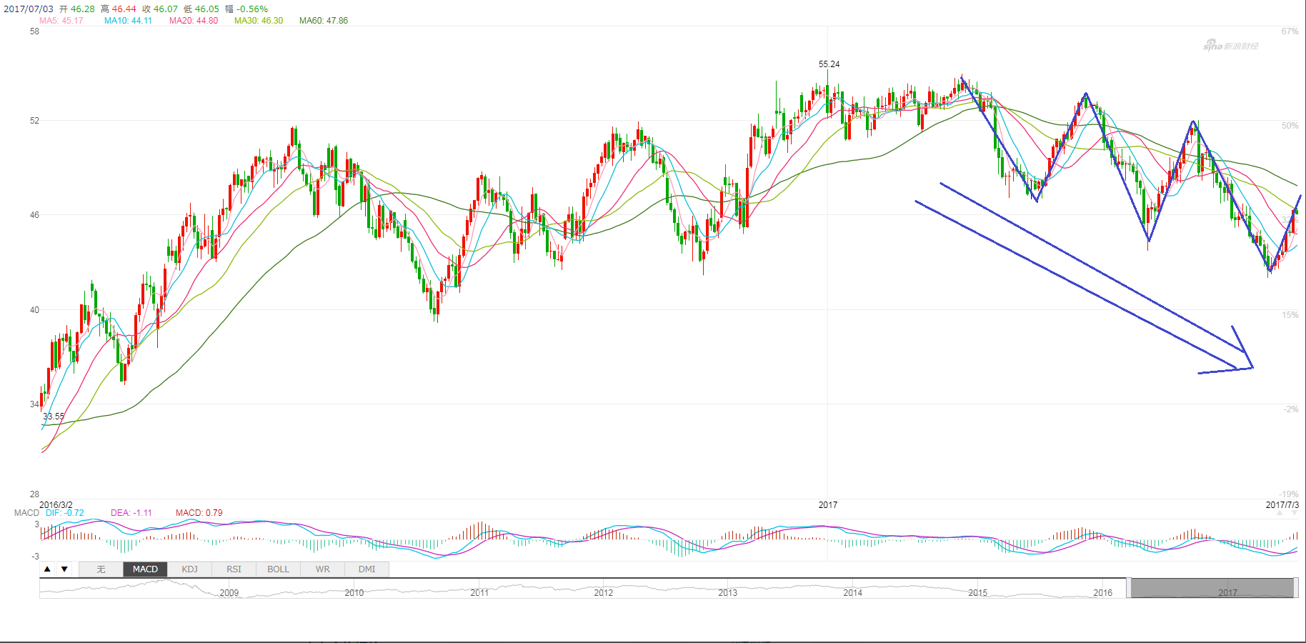 从基本面讲,现在是下降趋势应该是无可厚非,而且技术面也同样支持此观点,但是,最近的走势却让很多做空的投资者输得很惨。图2是原油期货价格的日K线图。