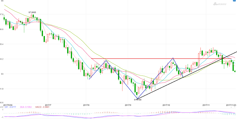 美元指数在创出90.0188的低点以后进入了一波上升趋势。这次反转走出了日线级别的头肩底的形态(蓝线),从底部形态来讲,是属于比较牢靠的底部结构。而且,第一次上冲颈线(红线)回落,第二次用大阳线突破颈线,都反映了市场对此颈线的重视,从另一方面证明了此处底部结构得到市场认可。同样在下跌时用大阴线突破颈线,并突破了此次上升的趋势线(黑线)。市场为什么在确认底部以后会再次出现跌破关键支撑线和趋势线呢?