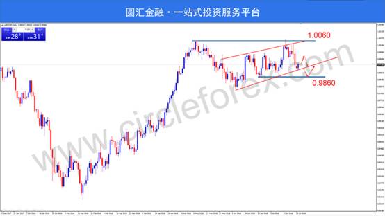 交易策略:考虑在关键支撑位0.9860附近进多,目标0.9950附近,止损40点左右。