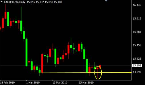 从白银日线图来看,价格跌至前期支撑区附近出现锤子形看涨K线形态,反弹将至,空单应考虑平仓。