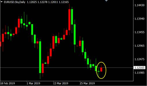 从欧元兑美元日线图来看,价格连续下跌之后出现十字星变盘信号,行情将发生变动。