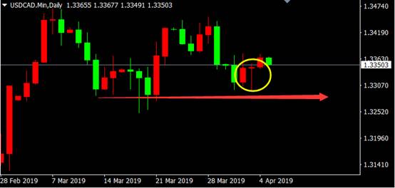 从美元兑加元日线图来看,价格在前期支撑区附近出现锤子线看涨K线形态,反弹将至,多单可以考虑继续跟进。