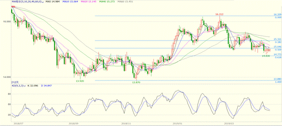 在经历了数周的调整后,近期白银逐渐企稳,隔夜银价跌至15.0一线。该位置是2018年的重要阻力位,于去年四季度被突破后,从技术角度而言转化为支撑位。目前银价再次考验这一位置,一旦企稳住,中线底部将得到确认。从黄金分割线的角度而言,15.0一线也是介于50%至61.8%的黄金分割回撤位,从调整幅度上看较为到位。目前金价已经站上5日均线,这是企稳的初步信号,值得重点关注。