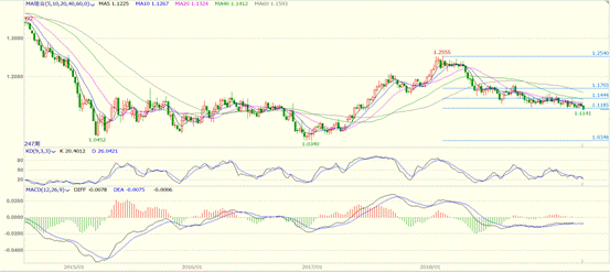 从技术面来看,欧元仍然处于下跌趋势中,特别是隔夜的破位下跌,更加确认这一格局。周线图上,目前汇率处于多条均线下方,而且往下没有任何可参考的技术支撑位。目前的点位处于61.8%黄金分割回撤位,建议耐心观望后市走向,因为欧元目前处于震荡寻底过程中。震荡指标表现来看,KD周线和月线图上都处于0-20超卖区间,显示后市下跌空间较为有限,但底部仍未明朗。从操作上讲,目前仍不宜抄底,需要等待月线技术面企稳才可考虑多头进场。
