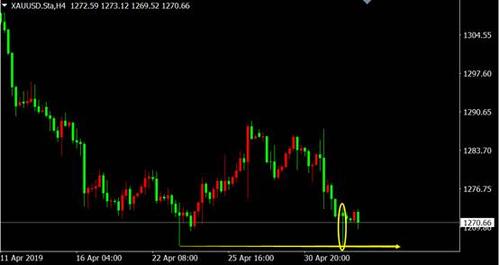 从国际黄金4小时图来看,价格跌至前期低点附近出现锤子线反转K线形态,反弹即将来临。