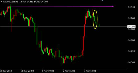 从白银1小时图来看,价格在前期高点附近出现连续阴跌看跌K线形态,反弹趋势将终结,多单应考虑止盈。