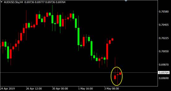 从澳元兑美元4小时图来看,价格在低位出现锤子线反转K线形态,反弹即将展开,多单可以考虑介入。