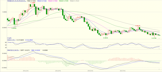 从技术面来看,澳元短线的回调更多是提供买入机会,汇率目前处于中长线底部区域。月线图上,KD指标在0-20已经形成金叉,之前数月澳元曾数次站稳5月均线,目前重回5月均线下方。0.700上方是前期重要支撑位,1月初澳元汇率曾短线闪崩考验2016年低位,但之后企稳回升。2018年至今,澳元汇率已经有5次在0.70一线获得支撑,该位置形成底部概率较大,也是中线较好买点。