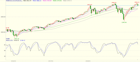 从技术上看,美股中线筑顶的概率较大。以标注普尔指数为例,指数在2872、2940两个高点形成M顶的两个头部,2600一线构筑颈线,市场在12月中旬突破颈线后,该M头技术形态即告成立。在美国总统特朗普上周末威胁要提高更多中国商品的关税后,标准普尔指数本周下跌逾75点,跌幅近2.5%。周线图上,标普指数一度跌破5周均线,KD指标在80-100超买区间形成死叉。这是调整开始的迹象,需要密切关注后市大幅下跌风险,下一支撑位2700一线。