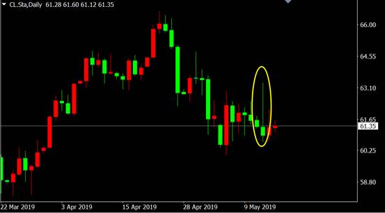 从WTI原油日线图来看,价格强势反弹之后出现经典上吊线反转看跌K线形态。