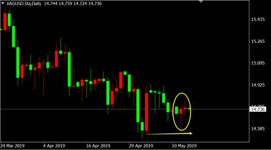从白银日线图来看,价格在前期低点附近出现锤子线看涨K线形态,再次夯实底部。反弹行情即将展开。