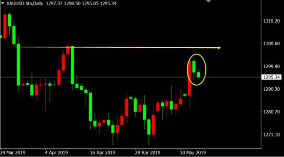 从国际黄金日线图来看,价格在前期高点附近出现经典看跌孕线K线形态,多头行情终结。