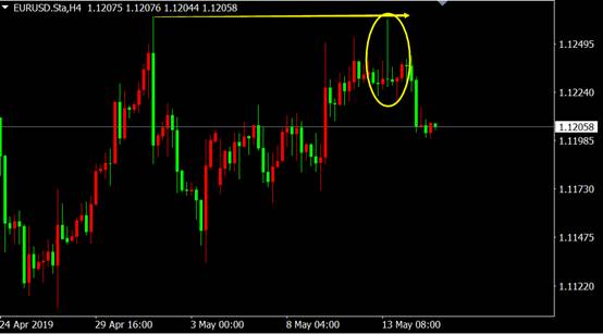 从欧元兑美元4小时图来看,在前期高点附近出现经典上吊线看跌K线形态,行情反弹恐将结束。
