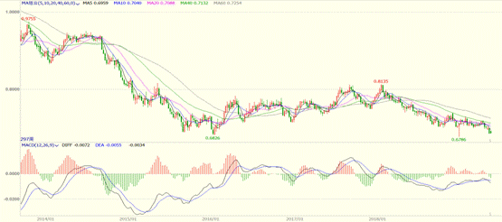 从图表上看,澳元汇率目前处于重要位置。就在上周,澳元一度下探至0.6862一线,但周一在澳大利亚大选结果刺激下短暂反弹。日内随着会议纪要的公布,最新汇率再度逼近0.6862附近。从长期来看,目前的位置也是2015至2016年的底部区域,能否撑住还有待观察。但是一旦失守该重要支撑位,后市将会是一个震荡寻底的过程。因此目前还不宜过早抄底,需要耐心等待。