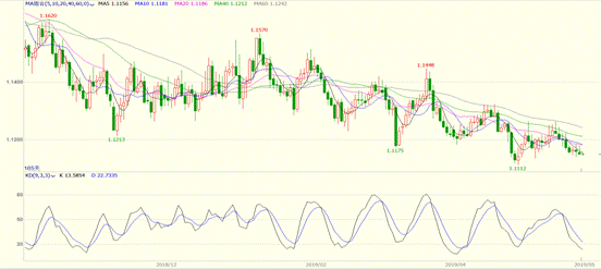 从技术走势来看,欧元今年可谓疲弱不堪,日线图上最新汇率即将考验前期低点。而且高点、低点呈现下降,这是延续下跌的走势。根据最新欧洲议会选举的选情调研,各国右翼势力抬头也将会引发欧洲政治局势动荡,不利于欧元后市。而且随着中美贸易战的恶化,人民币汇率贬值,势必对全球其他货币产生挤压,引发各大货币竞争性贬值的风险。各大风险叠加,导致欧元短期内难以掀起大规模反弹,不建议抄底做多。短线关注1.10-1.11一线能否守住。
