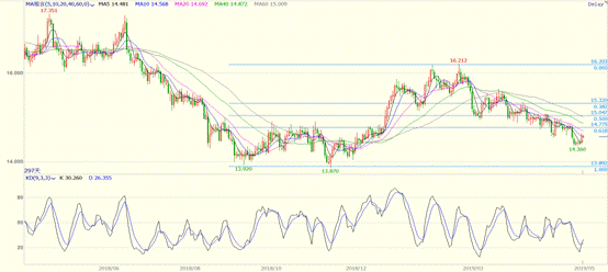 在经历了数周的调整后,近期白银逐渐企稳,隔夜银价突破5日均线。15.0是2018年的重要阻力位,于去年四季度被突破后,从技术角度而言转化为支撑位。从黄金分割线的角度而言,15.0一线也是介于50%至61.8%的黄金分割回撤位,从调整幅度上看较为到位。目前银价在最低下探至14.36一线,调整相当充分,此时向上突破,很可能是反弹开启的信号。