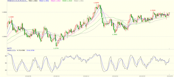 从技术面来看,美元兑加元目前处于上升行情尾声。从二月初至今,美加一直处于温和反弹中,目前汇率逼近2018年年底高位1.3678一线,后市存在较大压力。美元指数2019年以来一直处于95-97一线波动,既无法创新高,又未开启下跌趋势。美元的走高带动美加持续反弹,但是后市美元指数面临100点关口的压制,预计美加进一步走高难度也较大。从基本面看,未来向下突破的可能性更大,中线下一重要支撑位处于1.30上方。