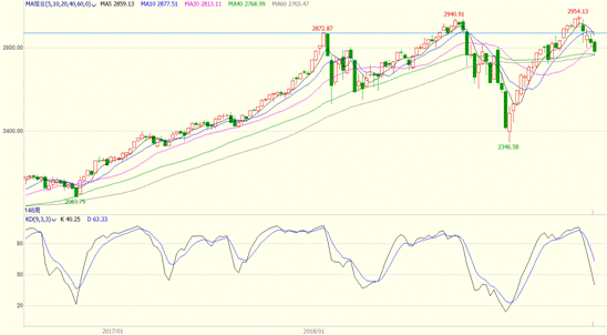 本周美股表现疲弱,三大指数连续下挫,隔夜标准普尔指数更是跳空低开,失守2800关口。从今年年初开始,标普指数从低点2346一线连续反弹,涨幅已经接近30%。随着标普指数下跌的开启,技术面看跌的信号越来越明显,中线下跌的可能不能排除。消息面方面,中美贸易战引发的恐慌情绪仍在市场弥漫,是威胁中美股市的重大风险因素。