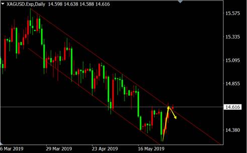 从白银日线图来看,价格涨至下行通道上轨附近,且反弹乏力,回调行情将再度开启。