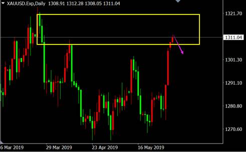 从国际黄金日线图来看,价格涨至前期压力区附近恐将出现滞涨回调,建议多单可以考虑先止盈出局。