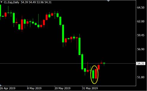 从WTI原油日线图来看,价格从底部出现吞没看涨K线形态,反弹行情将至,空单考虑逢低止盈。