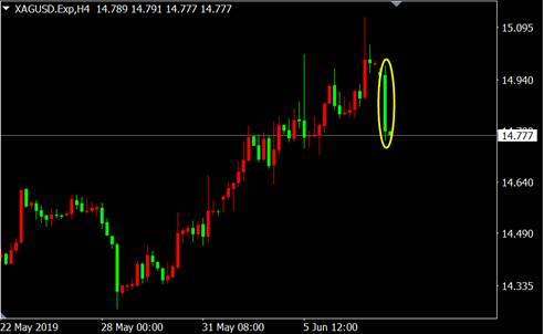 从白银4小时图来看,行情出现捉腰线经典看跌K线形态,多头行情将结束,空方再度来袭。