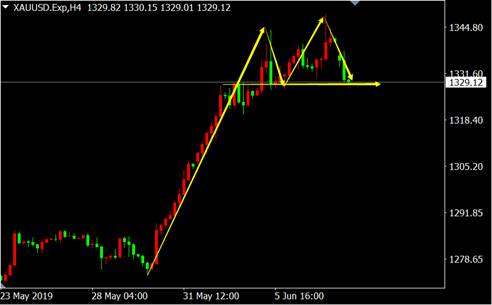 从欧元兑美元4小时图来看,价格上涨滞涨之后出现阴跌走势,多头行情恐将结束,多单可以考虑先获利了结。