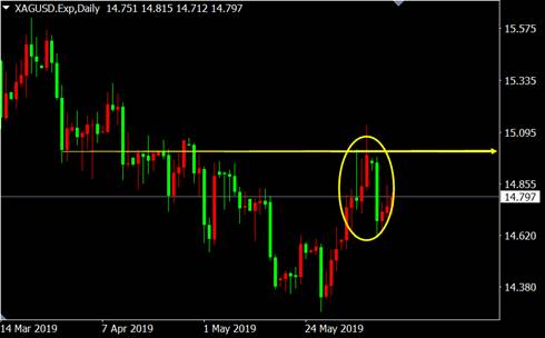 从白银日线图来看,行情在前期压力区附近出现捉腰线经典看跌K线形态,多头行情将结束,空方再度来袭。