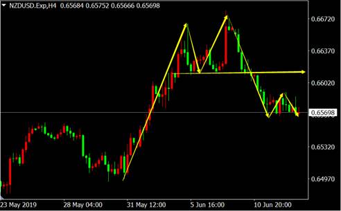 从纽元兑美元4小时图来看,价格顶部出现双头顶看跌K线形态,且跌破颈线位,空方行情再度开启。