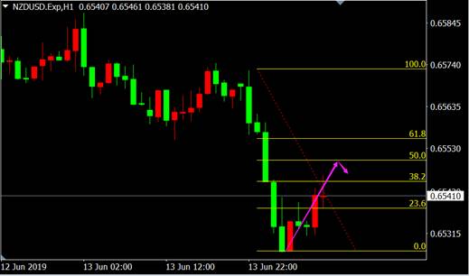 从纽元兑美元1小时图来看,价格即将反弹至黄金分割位50%的位置,若上行遇阻,反弹行情即将结束。