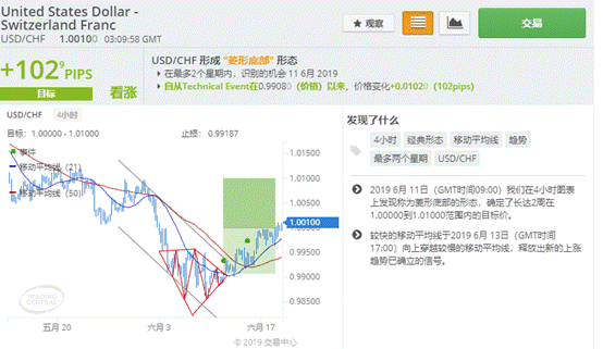 美元/瑞郎维持震荡走势,日线图中价格围绕1.0000整数位关口出现宽幅震荡。目前很可能上涨回踩趋势线.目前GKFXPrime特色分析工具Recognia呈现看涨信号。
