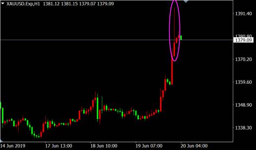 受美联储利率决议鸽派发酵的影响,美元遭遇重挫黄金多头强势,金价迅速刷新自2013年8月30日来高位,但从国际黄金1小时图来看,上涨势头趋缓且出现经典看跌上吊线K线形态,多头仓位应该考虑获利了结。
