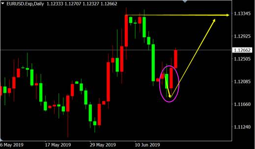 从欧元兑美元日线图来看价格出现反击线反转K线之后行情一路上行,多头止盈可以放在前期高点附近。