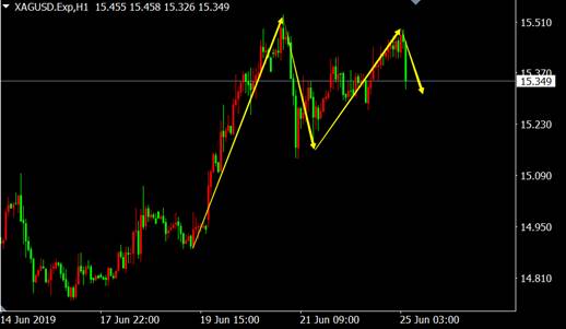 从白银1小时图来看价格高位滞涨,并形成双头顶看跌K线形态,多头行情恐将暂告一个段落。