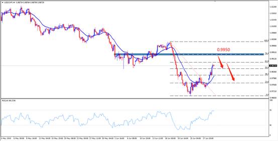 技术点评:H4周期中,美瑞汇价处于大跌后的调整阶段,上方阻力位处于斐波那契数列76.4%位置,即0.9950区域。