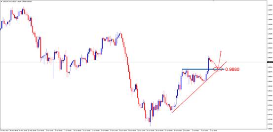 交易策略:激进的投资者可考虑0.9880附近轻仓做多,止损0.9830左右,目标0.9950左右。
