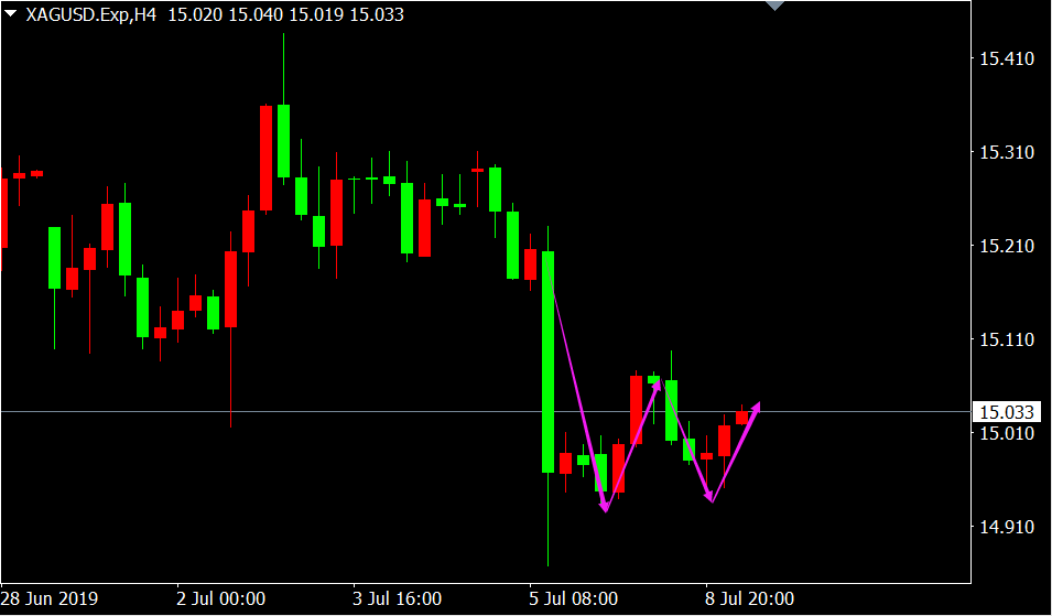 从白银4小时图来看,价格下跌末期出现W底看涨K线形态,反弹行情即将展开,空单应考虑逢低获利了结。