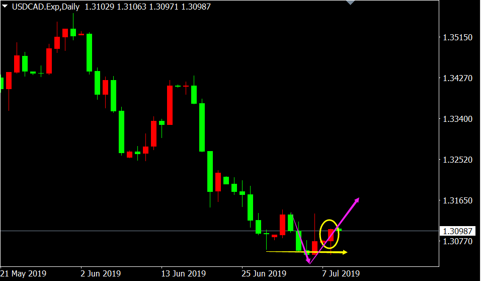 从美元兑加元日线图来看,价格下跌末期出现锤子线再次测试前期低点并且企稳,平头底形态成立,反弹行情即将开启。